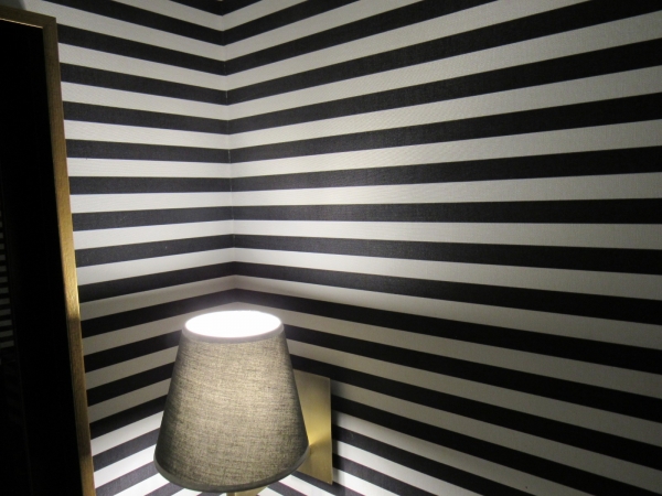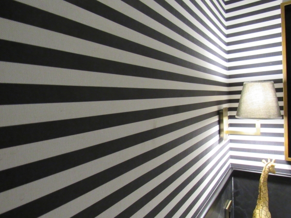 Several walls were covered in Marcel Patisserie in Yenikoy, Istanbul with digital printing on textile-backed vinyl wallpaper type. A custom tropical design was created for one big wall just near the staicase and walls behind each table were covered with black and white goose-foot design to match the rest of the decoration elements. The wall on WC was covered with bold black and white horizontally striped wallpaper. All prints were done on textile-backed vinyl which causes the prints to look lively and with it's damage resistance feature it is a popular paper type to be used in high traffic areas.